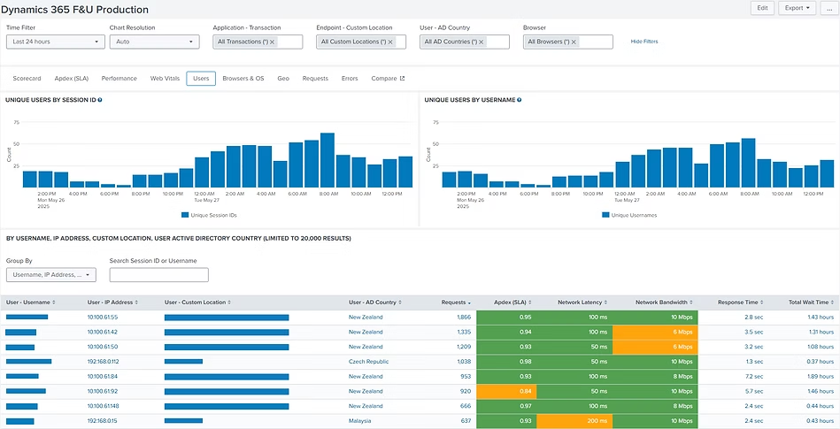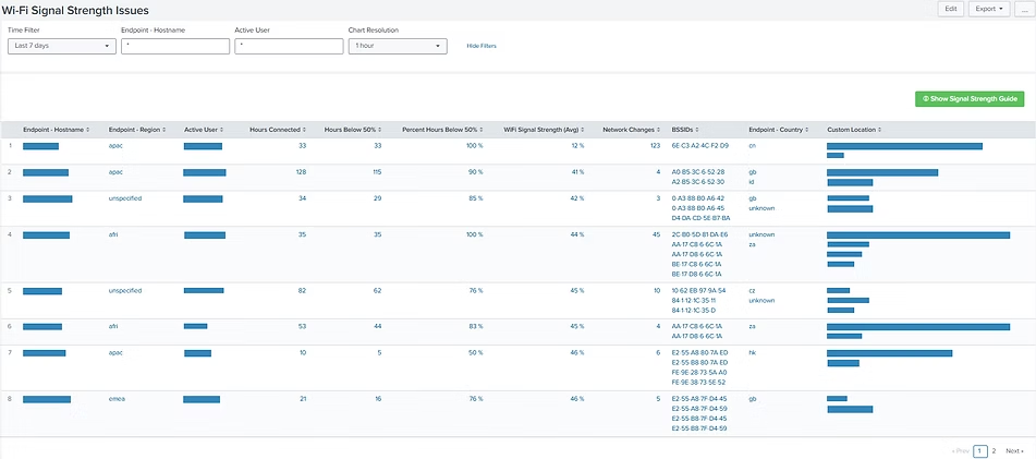 Detalles completos de usuarios y endpoints sobre latencia de red y disponibilidad de ancho de banda mientras trabajan en una aplicación de negocio desde cualquier lugar. Profundice hasta una solicitud individual o examine las condiciones locales de Wi-Fi del endpoint durante la sesión de la aplicación.