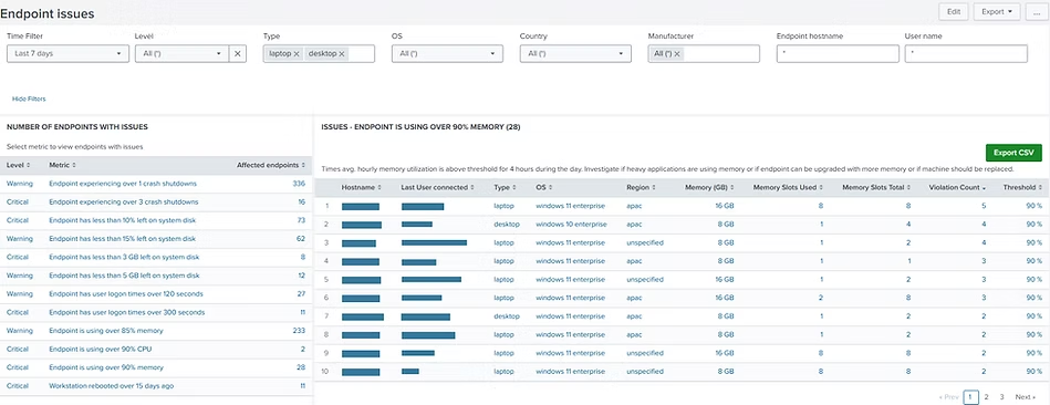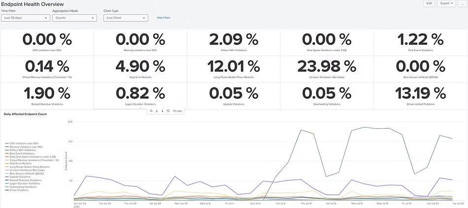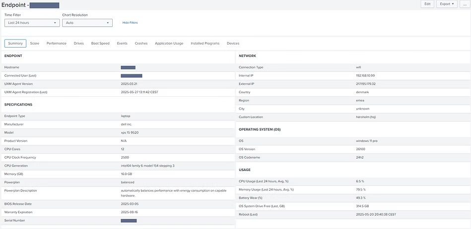 UXM supervisa, analiza y reporta de forma continua una amplia gama de métricas de estado y rendimiento de los endpoints, ayudándole a detectar y resolver problemas de manera proactiva antes de que afecten a los usuarios.
