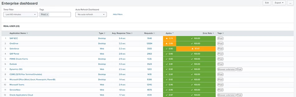 Obtenga una visión completa del estado y el rendimiento de todas las aplicaciones clave, con datos basados en la actividad de usuarios reales, sin importar desde dónde trabajen.