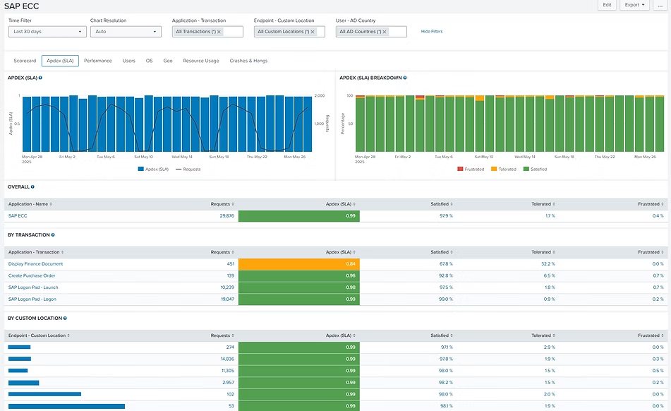 Supervise transacciones reales de usuarios, específicas por tarea, como “Apertura de facturas”, “Búsqueda de pedidos de clientes” y otros flujos de trabajo críticos para el negocio, directamente dentro de la interfaz gráfica de la aplicación.