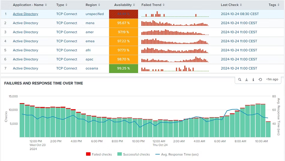 Pruebas sintéticas: Monitoree la disponibilidad y velocidad de Active Directory (AD) desde cada endpoint, con alertas automáticas si no se cumplen los umbrales de rendimiento (por ejemplo, para más de 15.000 endpoints).